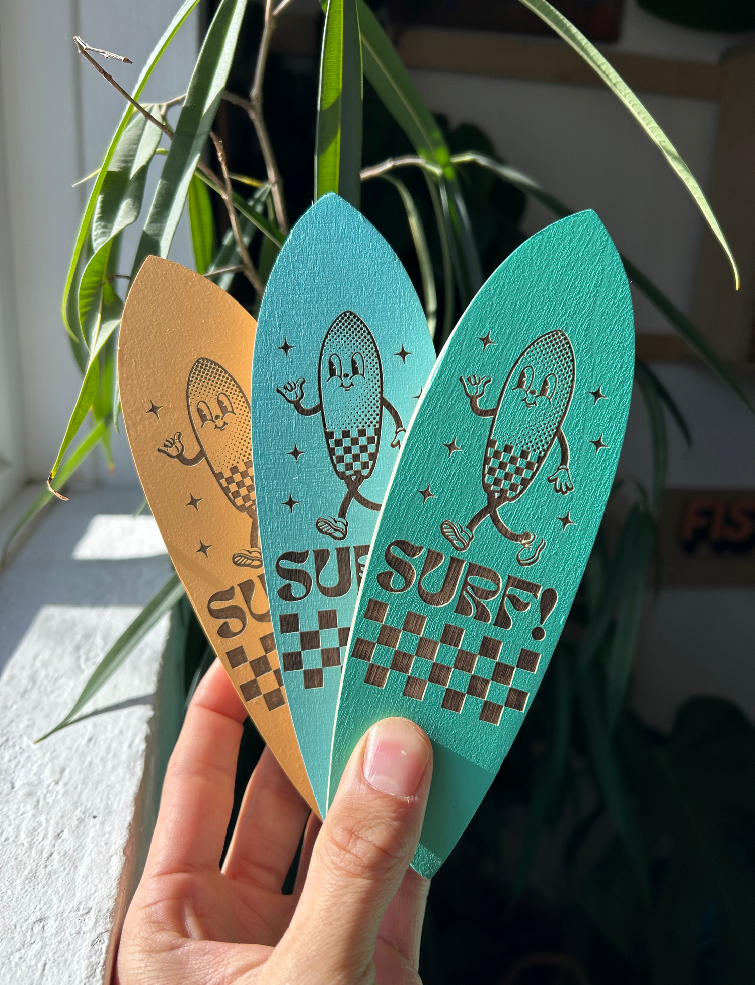 Bring the surf lifestyle home with this vintage-inspired laser-engraved wooden magnet with a vibrant turquoise finish.
